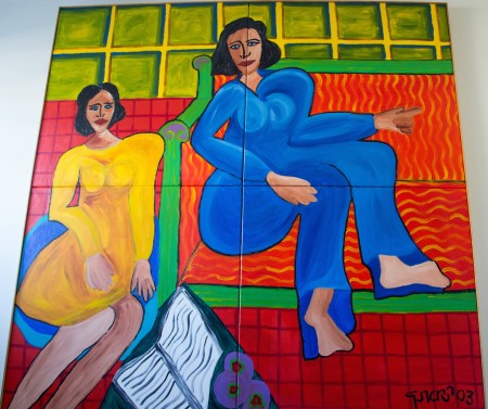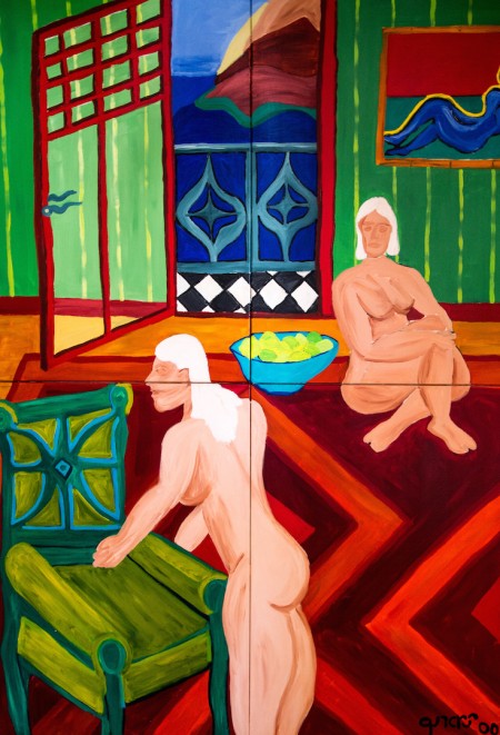 two women, a book and fruit 2003 h 180 x w 180 cm